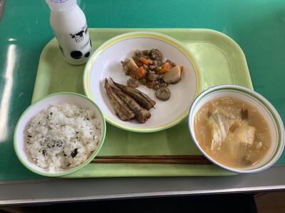 わかめご飯、春野菜の味噌汁、メヒカリの唐揚げ、根菜のそぼろ煮、牛乳 です。
