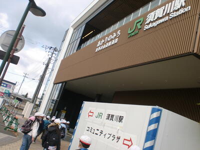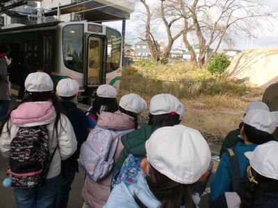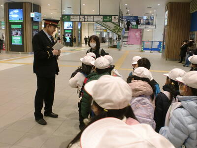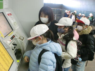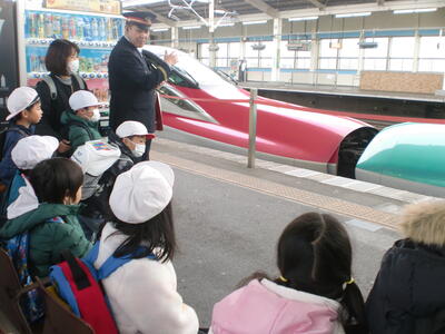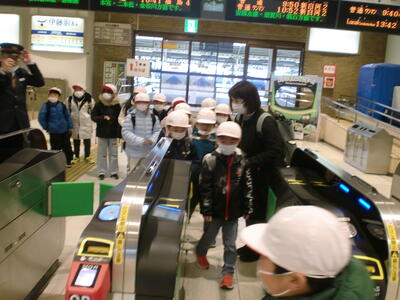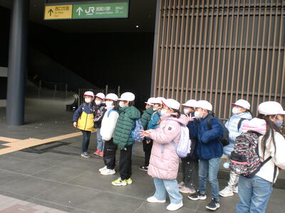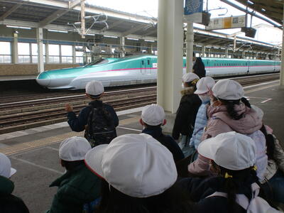11月19日より延期になっていた電車での郡山駅見学へ行ってきました。2年生全員、とってもとっても楽しみにしていました。全員そろっての見学学習、みんなわくわくでした。須賀川駅までバスで行き、切符を買ったり、階段を上ったり下ったりしてやっとホームへ。他の客さんもたくさんいたのでお行儀よく乗車しました。郡山駅では、改札に切符を入れ、駅員さんに案内していただき、新幹線ホームへ。通過する新幹線を見て「ヒエーッ!!」「うるさーい!!」と歓声をあげての大興奮。つばさやこまちの連結しているところを見ることもできました。案内してくださった駅員さんには感謝!!です。