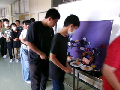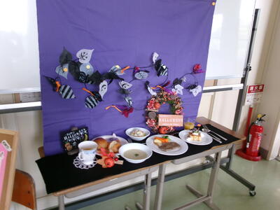 10月3日は、6年生が楽しみにしていた「テーブルマナー給食」でした。廊下には、ハロウィンの飾りとメニューが飾られ、音楽室が「すがまっ子レストラン」となり、準備万端に6年生を待っていました。4校時が終わった6年生が廊下の飾りを見て目をキラキラさせ、入店しました。