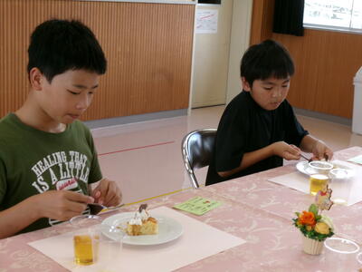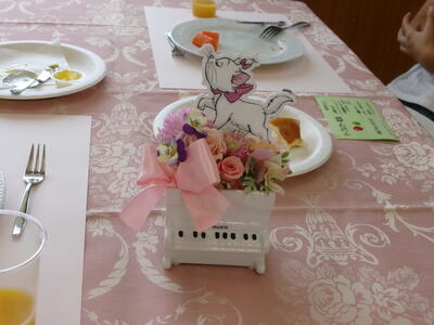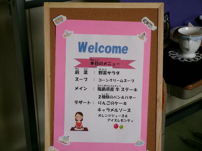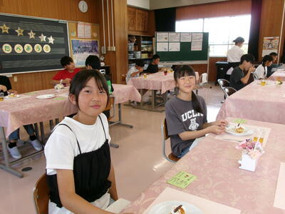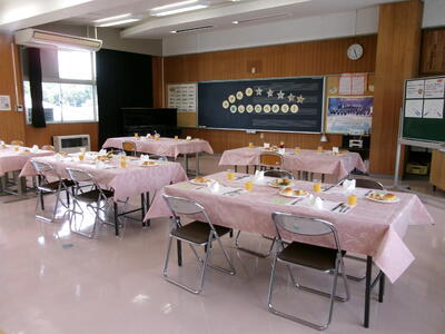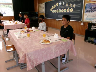 いただきますのあいさつの後、緊張しながら周りをきょろきょろ・・・。出てくる料理を「おいしい」と言って食べていた表情が本当に「おいしい」が伝わってくるものでした。今日は、給食センターの方が1~5年生の給食を作る傍ら準備してくださいました。手作りケーキも朝から給食センターで作ってくれたものだそうです。テーブルにも花が飾られ、かわいいディズニーのキャラクターやディズニーの音楽もとっても素敵でした。子どもたちもニコニコ笑顔で感謝の気持ちをもっていただだきました。ほんとうにありがとうございました。
