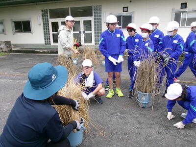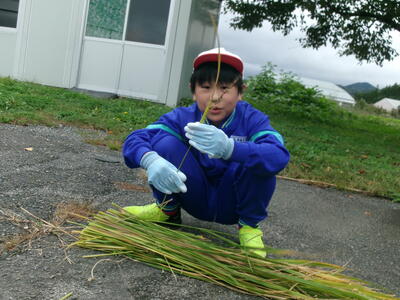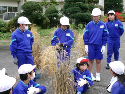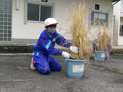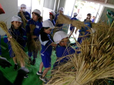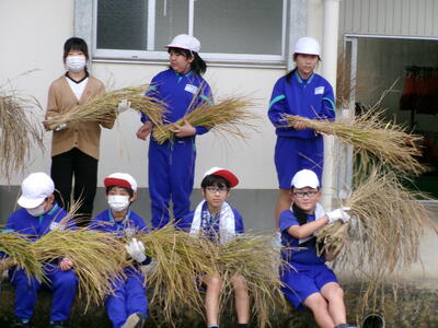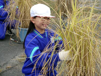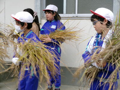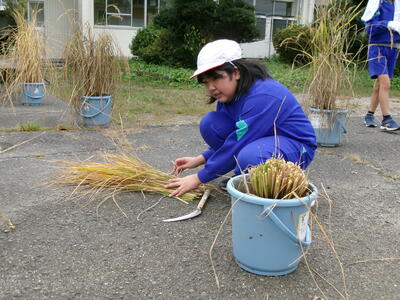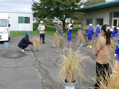 5月に5年生がバケツに植えた稲の稲刈りが10月6日に行われました。JAゆめみなみの職員の話をよく聞いて、指示された手順通りに行いました。中には、稲刈りの手伝いをしている児童もいて、手慣れた様子で刈ったり縛ったり干したりする様子も見られました。JAの職員の方が丁寧に指導をしてくださいました。ありがとうございました。