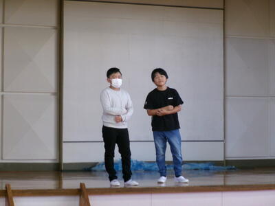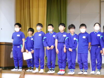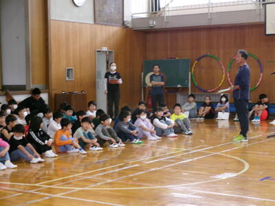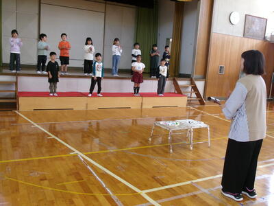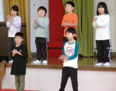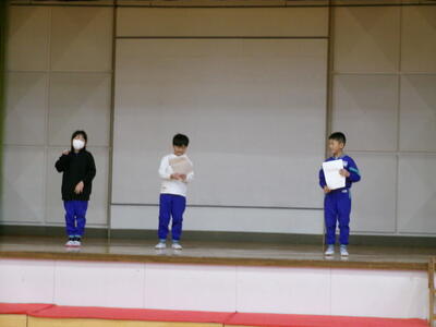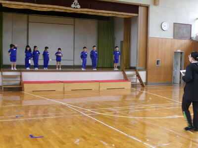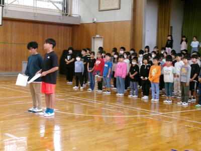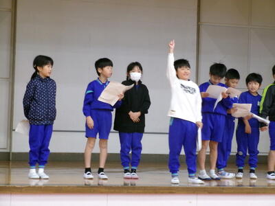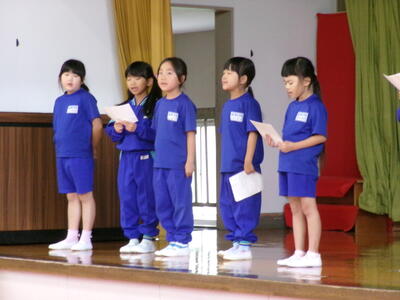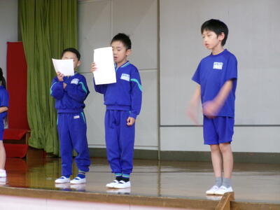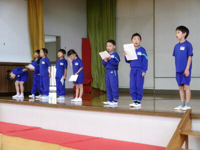 3連休明け、子どもたちが元気に登校しました。2週間後に迫った学習発表会の練習に向けてもがんばっています。今回は、1年生の開会の言葉、体育館練習を紹介します。