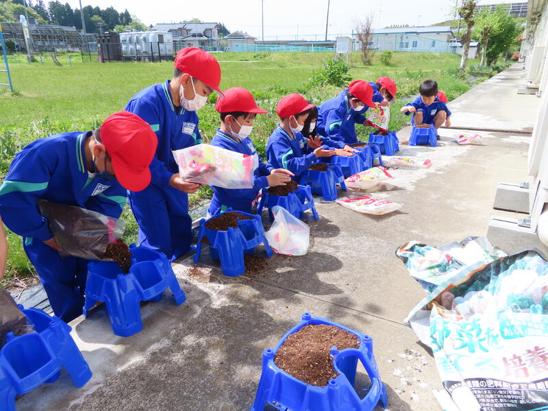 連休の合間に1年生がアサガオの種まきを行いました。アサガオは入学後間もない子どもたちでも栽培が容易であり、変化や成長が速いので、かかわりを通して満足感や成就感も味わうことができます。教室で種まきの手順や世話の仕方、観察の仕方などを確認してから、種まきに挑戦しました。担任の指示やアドバイスに従って、水やりまで無事に終わらせることができました。