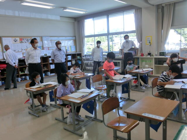 村教育委員訪問がありました。村の教育行政における教育活動の進捗状況の様子を視察していかれました。学校経営の概要説明後、各教室を参観しました。各教室では電子黒板を使用した授業やペアやグループになって答えの導き方を共有する授業が展開されていました。分からないで困っている子を一人でも減らすこと、そして全体の底上げを図っていくことがこれからの目標となってきますので、基礎基本の確実な定着を積み上げていくことの重要性を改めて確認しました。