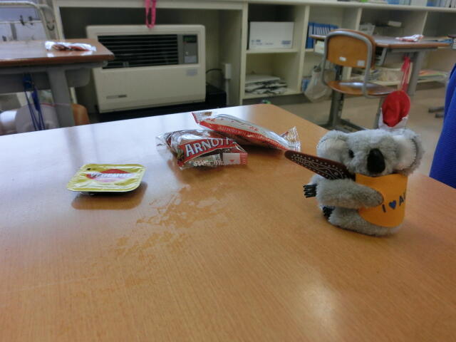 外国語科の授業で5・6年生は、オーストラリアの小学校との交流を行っていますが、先日現地からビスケットとベジマイト、ミニコアラのぬいぐるみ?が届きました。早速、給食の時間にALTが配付して試食をしました。子どもたちは、「しょっぱくて複雑な味」と顔をしかめる子が多かったです。食文化の違いを敬遠するのではなく、他を尊重しながらさらに相互理解につながっていくといいなと感じました。今後も交流を続けていく予定です。