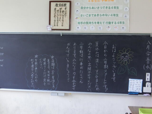 残暑が厳しい1日となりました。子どもたちは暑い中でも快適な教室環境(エアコン、換気)の中で、夏休み中の課題を振り返ったり、新しく入る学習の見通しをもったりと、二学期終わりの自分をイメージして計画を立てていました。各教室では、夏休み中に作製した作品が所狭しと展示されています。子どもたちの取り組みにつきまして、その都度働きかけをしていただきありがとうございました。後日紹介していきます。