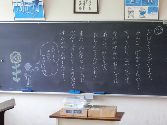 ひっそりと静まり返った校舎に、明日から子どもたちの元気な声が戻ってきます。生活のリズムは取り戻せているでしょうか。明日の持ち物を確認して早めに就寝できるといいですね。明日は、A4日課となりますので、下校は12:00頃(給食なし)になります。よろしくお願いします。各学級では、子どもたちを温かく迎えようと、黒板に熱いメッセージが書かれていました。年度後半に向かって子どもたちがどのような目標を立て、また、どんな活躍を見せてくれるのか今からわくわくしています。