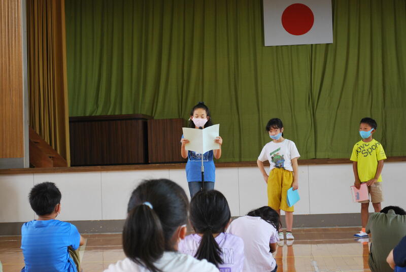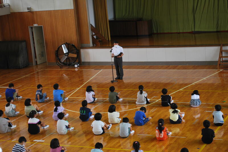 2校時目に第2学期始業式を行いました。大きな事故・けがなく子どもたちは元気に学校に戻ってきました。大変お世話になりました。子どもたちには、オリンピック開催に伴って、一人ひとりが自分を高めるために、勉強も含めて、自分なりの目的意識をもって、友だちと励まし合いながら、精一杯実力を発揮して実りのある2学期にして欲しいと話をしました。次に、全校生を代表して2・4・6年生の児童が、1学期の取り組みを振り返りながら、運動や学習(暗唱、計算)を頑張って取り組んでいきたいとの抱負を発表しました。どの子もとても立派な態度で式に臨むことができていました。