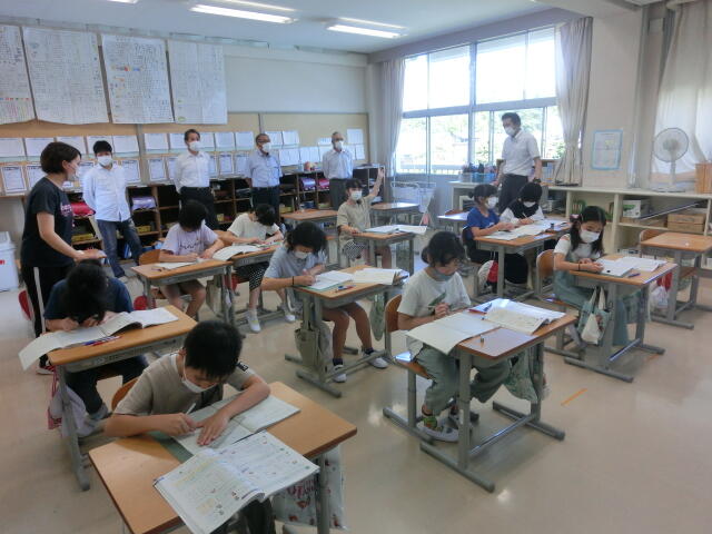 村教育委員訪問がありました。村の教育行政における教育活動の進捗状況の様子を視察していかれました。学校経営の概要説明後、各教室を参観しました。各教室では電子黒板を使用した授業やペアやグループになって答えの導き方を共有する授業が展開されていました。分からないで困っている子を一人でも減らすこと、そして全体の底上げを図っていくことがこれからの目標となってきますので、基礎基本の確実な定着を積み上げていくことの重要性を改めて確認しました。