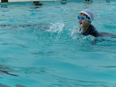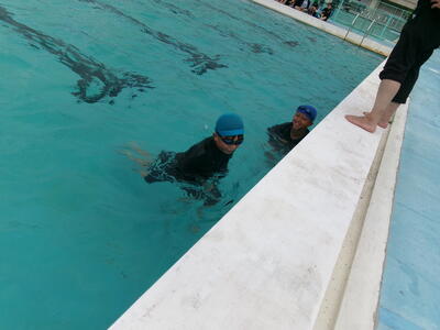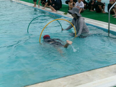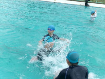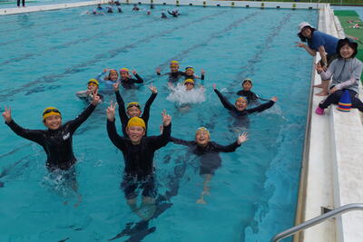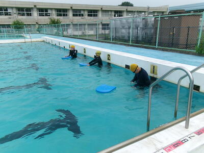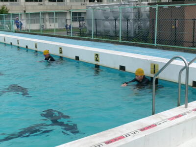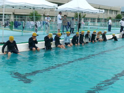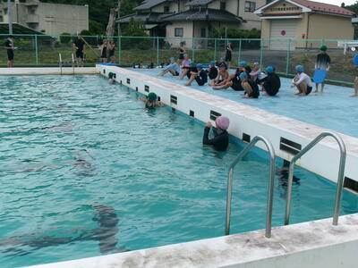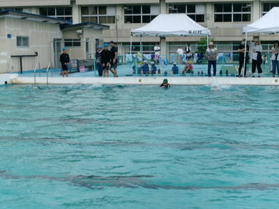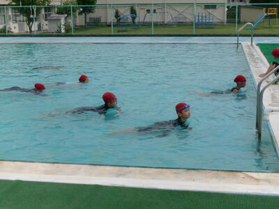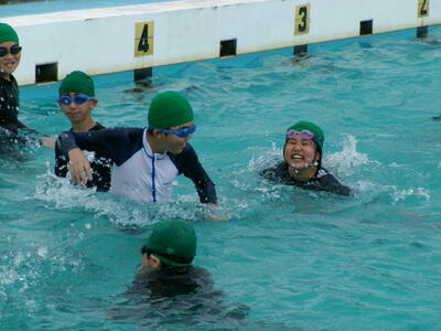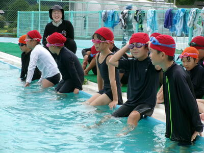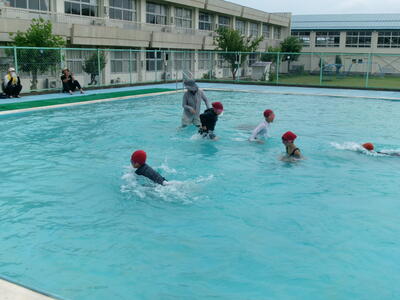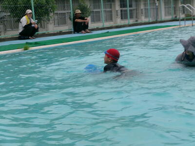 延期の続いた12年生の水泳記録会が16日(水)の23校時目に行われました。1年生は、学校の広いプールでの初めての学習でしたが、だんだん水にも慣れ、もぐったりわにさんで歩いたりすることができるようになりました。