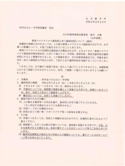 玉川村教育長より、「新型コロナウィルス感染症に伴う臨時休校について」が配布されました。