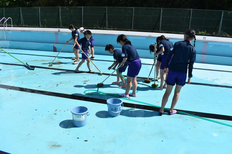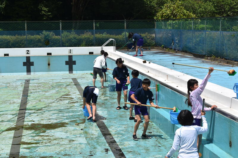 5月24日(水)に、全校生でプール清掃を行いました。それぞれの学年ごとに作業を分担し、プールサイドや壁面の汚れを落としたり、プールにたまった泥を洗い流したりしました。水にぬれる苦労を厭わず(水にぬれることを楽しみながら)、いきいきと作業に取り組む児童の姿が見られました。そのかいあって、プールはとてもきれいになりました。