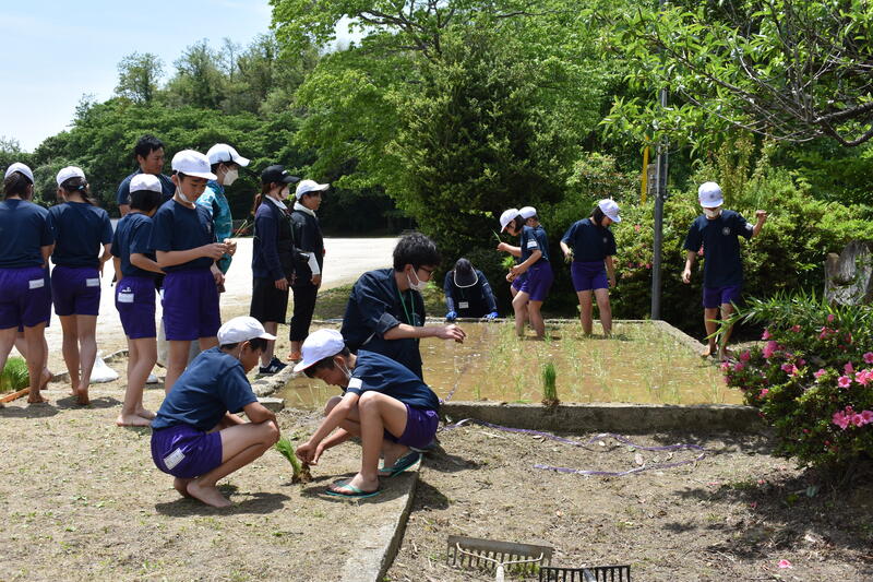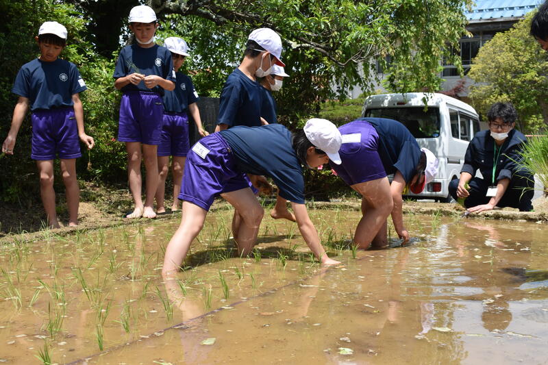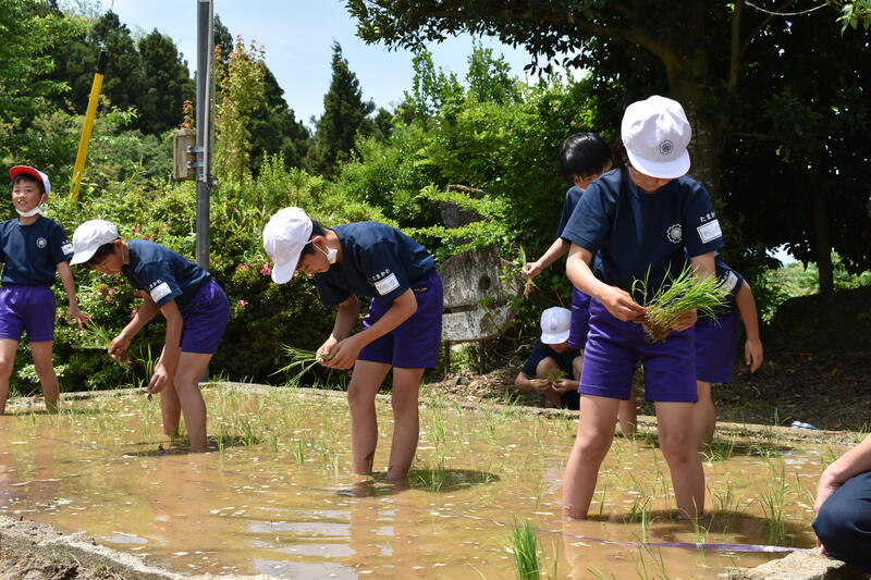 5月30日(火)に、5年生が田植え体験をしました。子どもたちは、JA夢みなみの職員の方々に苗を準備していただき、植え方の手順を教わりました。学校の田んぼは、一般的な水田に比べとても狭いのですが、それでもまっすぐ等間隔に植えるために、ひもで目印をつけて、ぬかるみに足を取られながら苦労して苗を植えていました。米作りの苦労・工夫を体験する良い機会となりました。今後は、無事に収穫できるよう、水量を調節したり成長の様子を観察したりと、管理の大切さを学んでいきます。