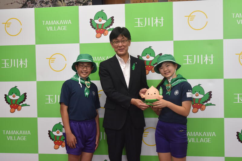 6月6日(火)に、緑の少年団の団長と副団長が学校を代表して、玉川村長さんへ緑の羽根募金を届けました。本校では、児童会の代表委員会が中心となり、各教室を訪問し募金を呼びかけてきました。団長が、「村の自然環境のために役立ててください」と述べ、村長さんへ募金を渡しました。その後、須釜小学校の代表児童とともに懇談が行われました。その場に立ち会った大人たちが驚くほど、会話が盛り上がり、楽しい時間を過ごしました。募金にご協力いただいた皆様、ありがとうございました。