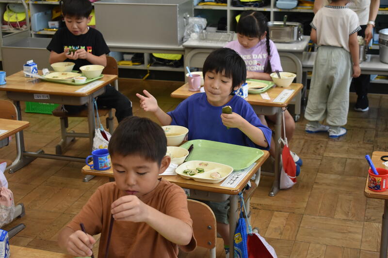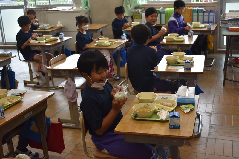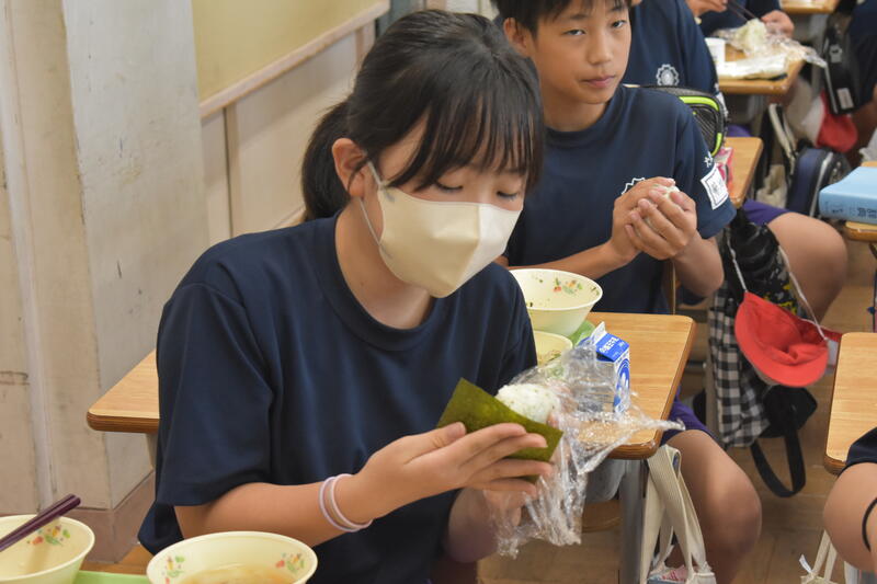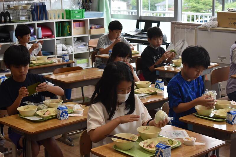 6月15日(木)は、創立記念日の前日ですが、開校当時に思いを馳せて、創立150周年記念給食を実施しました。当時の昼食を完全に再現することは難しかったため、明治22年に山形県鶴岡市の忠愛小学校で提供された給食をモチーフとした献立が考案されました。メニューは、菜飯、のり(150周年記念包装)、沢庵和え、鮭の塩焼き、田舎汁、プリン、牛乳です。子どもたちは、ラップを用いて思い思いの形におにぎりを握り、おいしそうに食していました。丸いおにぎり、三角のおにぎり、全面のりで覆ったおにぎり、一部だけのりで覆ったおにぎり、鮭を具にしたおにぎりなど、オリジナルのおにぎりを作って食べることがとても楽しかったようです。150周年に華を添えてくださった給食センターの皆様に感謝いたします。