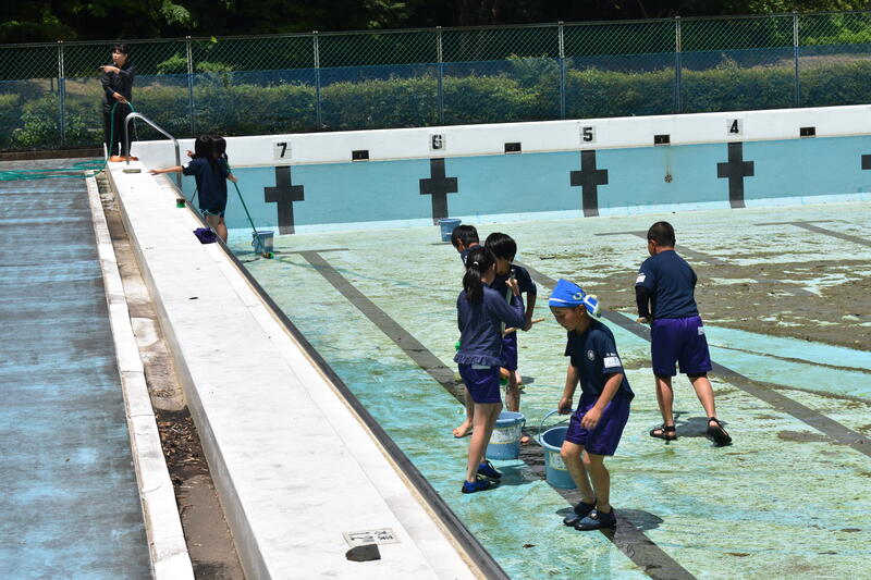 5月24日(水)に、全校生でプール清掃を行いました。それぞれの学年ごとに作業を分担し、プールサイドや壁面の汚れを落としたり、プールにたまった泥を洗い流したりしました。水にぬれる苦労を厭わず(水にぬれることを楽しみながら)、いきいきと作業に取り組む児童の姿が見られました。そのかいあって、プールはとてもきれいになりました。