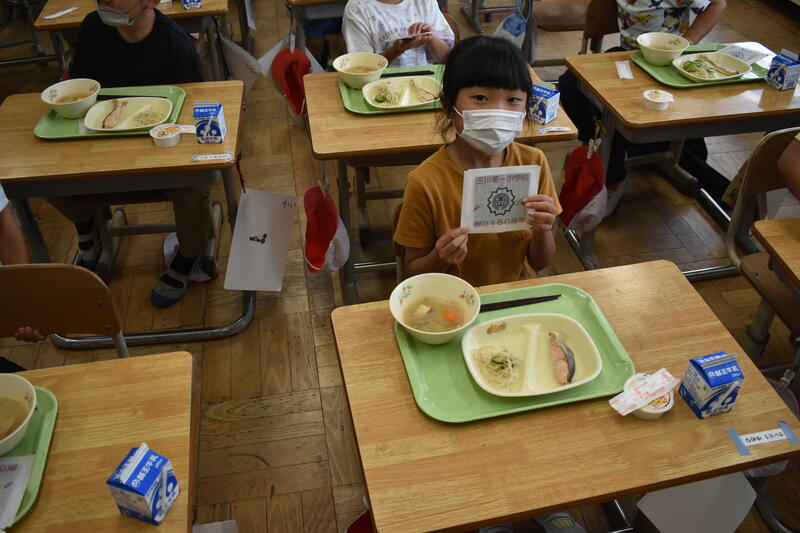 6月15日(木)は、創立記念日の前日ですが、開校当時に思いを馳せて、創立150周年記念給食を実施しました。当時の昼食を完全に再現することは難しかったため、明治22年に山形県鶴岡市の忠愛小学校で提供された給食をモチーフとした献立が考案されました。メニューは、菜飯、のり(150周年記念包装)、沢庵和え、鮭の塩焼き、田舎汁、プリン、牛乳です。子どもたちは、ラップを用いて思い思いの形におにぎりを握り、おいしそうに食していました。丸いおにぎり、三角のおにぎり、全面のりで覆ったおにぎり、一部だけのりで覆ったおにぎり、鮭を具にしたおにぎりなど、オリジナルのおにぎりを作って食べることがとても楽しかったようです。150周年に華を添えてくださった給食センターの皆様に感謝いたします。