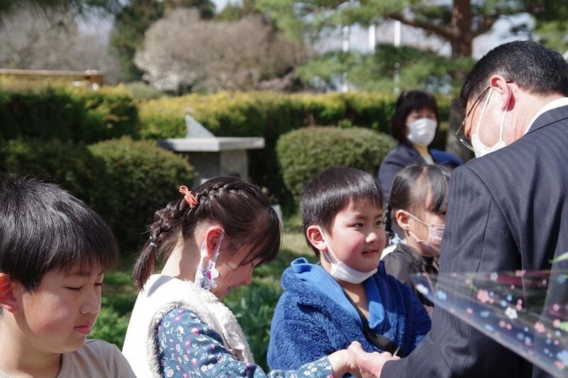 今年度は、在校生として5年生だけでなく4年生も参加し、盛大!?実施することができました。村長様もご参加いただき、地域の方々にも見守られながらの優しい式となりました。