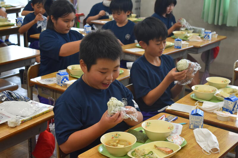 6月15日(木)は、創立記念日の前日ですが、開校当時に思いを馳せて、創立150周年記念給食を実施しました。当時の昼食を完全に再現することは難しかったため、明治22年に山形県鶴岡市の忠愛小学校で提供された給食をモチーフとした献立が考案されました。メニューは、菜飯、のり(150周年記念包装)、沢庵和え、鮭の塩焼き、田舎汁、プリン、牛乳です。子どもたちは、ラップを用いて思い思いの形におにぎりを握り、おいしそうに食していました。丸いおにぎり、三角のおにぎり、全面のりで覆ったおにぎり、一部だけのりで覆ったおにぎり、鮭を具にしたおにぎりなど、オリジナルのおにぎりを作って食べることがとても楽しかったようです。150周年に華を添えてくださった給食センターの皆様に感謝いたします。