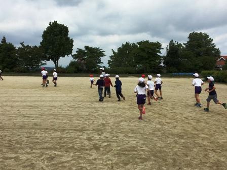 校庭(トラックの中)をさらに区切って、鬼ごっこをしています。紅帽子の子が鬼でしょうか。