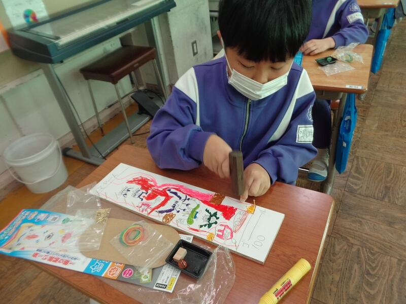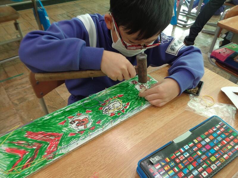 図画工作科の時間に、板に釘を打ち付けて、迷路づくりに格闘中です。初めての釘打ちはなかなか慣れず、血豆を作る子どもたちも何人か・・・。でも,これも経験です。少しずつ少しずつ慣れて、金槌の表と裏を上手に使い分ける児童も出ました。作品の完成が待ち遠しいですね。