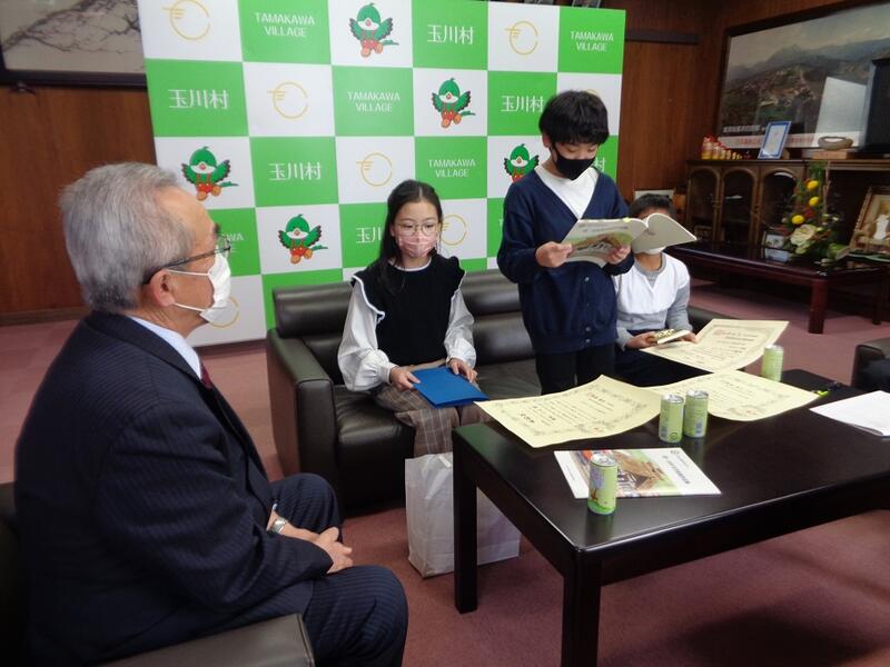 昨日は、夏休みに取り組み優秀な成績を修めた、青少年赤十字社主催の100文字提案と統計グラフコンクールの受賞報告に村長室へ出かけました。部屋には村長さん、副村長さん、教育長様が、子どもたちの到着を待っていてくだいました。受賞の報告の後は、様々な質問が飛びだし、さながら有名人の記者会見のようでした。また、3名の方々からお褒めの言葉や激励の言葉をたくさんいただいて帰って参りました。(さるなしジュースも・・・)