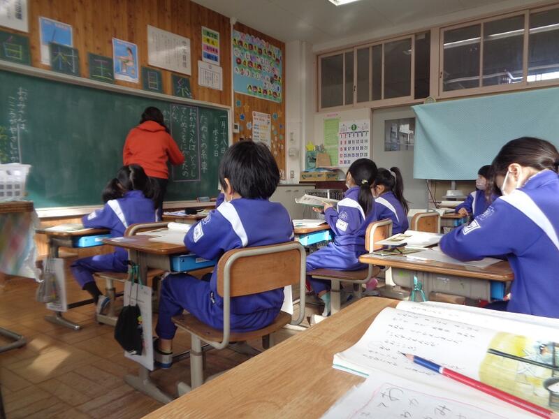 教室をのぞくと、みんな楽しそうに学習しています。学習内容は国語、ご存じ「たぬきの糸車。」