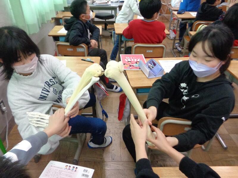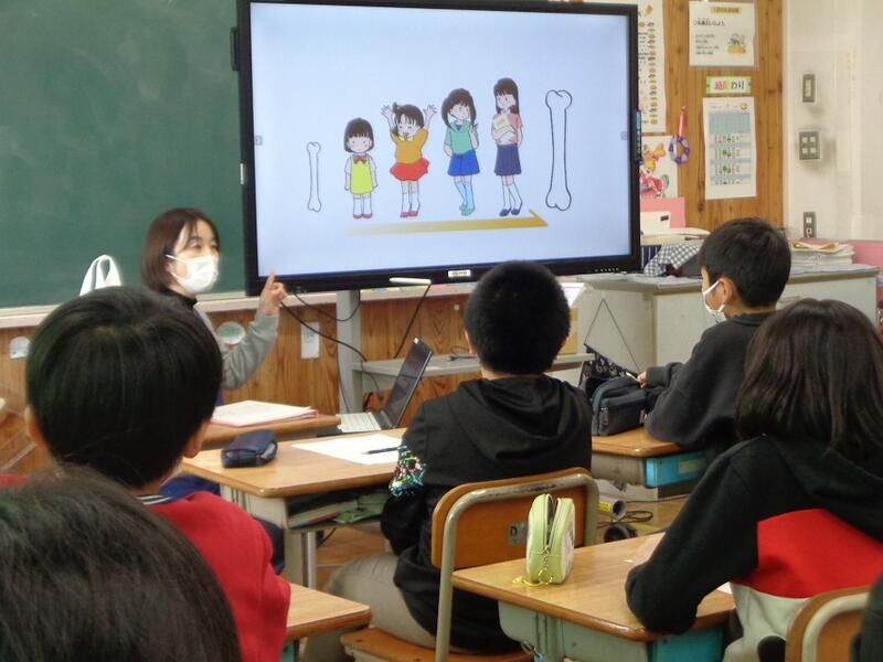 今日の4年生は、本校養護教諭の秋山先生の特別授業。内容は人体の不思議!?骨について。