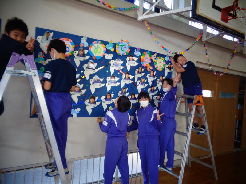 今日は、明日の会場設営を5年生が中心になって進めました。会場となる体育館の飾りつけや当日の段取りの確認など大忙しです。5年生にとっては6年生からのバトンを引き継ぐ大切な会ですので、準備にも力が入ります。段取り良く会場が作られる中、明日を前にプレッシャーも⁉と思いきや不思議です、カメラを向けるとみんな笑顔で答えます。働き者の5年生集団、楽しみながら準備を進めました。明日は頼みましたよニューリーダー。感謝をこめて!