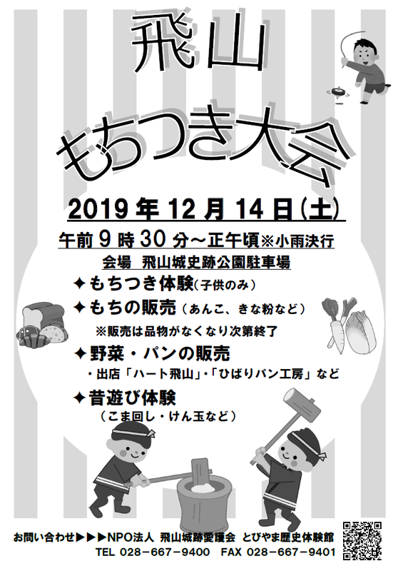 ★もちつき体験(子供のみ) ★もちの販売(あんこ、きな粉など) ※販売は品物がなくなり次第終了します。 ★野菜・パンの販売 出店「ハート飛山」「ひばりパン工房」など ★昔遊び体験(こま回し、けん玉など) |
