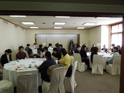 3グループでの意見交換15:00~16:00 全体会16:00~16:30(グループ代表による発表、質疑) 懇親会16:30~18:00(立食パーティ、サプライズのくじ引きで楽しい時間を共有した)、初めての試みで、参加者全員が意見を発表し合い有意義な話し合いになった。