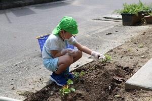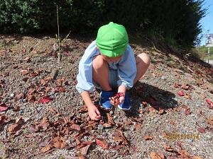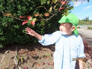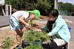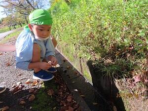 数少ない虫捕り網を、仲良く貸しあいながら頑張って虫を探しました。はじめのうちはおっかなびっくりで捕まえられませんでしたが、先生方がお手本で捕まえた虫を見ると、がぜんやる気を出してきた子ども達。最後には2つのかごに入りきらないほどたくさんの虫を捕まえました。トノサマバッタ・ショウリョウバッタ・モンキチョウ・ナナホシテントウなど、夢中になって楽しく捕まえました。