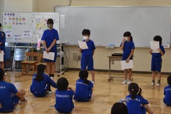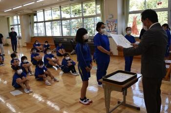 21日からの「秋の全国交通安全運動」に向けて、防災無線の録音を行いました。今回は3・4年生の女子が担当しました。