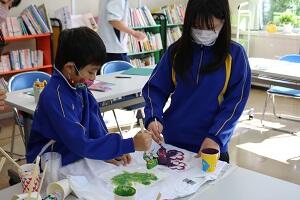 低学年は、教室で自己紹介をしたあとに生活科の「お店屋さんを開こう」で楽しい時間を過ごしました。3つのグループに分かれて、店員役とお客役を交代しながらたくさんのお店で楽しみました。