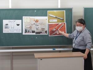 主任栄養技師から、ナイフ・フォーク・スプーンなどの種類と使い方、食事が運ばれてくる順番や