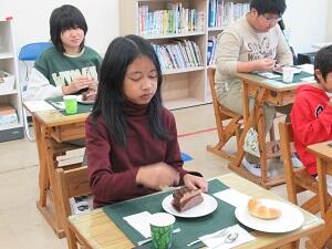 みんな音を立てずに、上手にスープを口に運んでいますね。パンは1口サイズにちぎっていただきます。