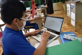 本やインターネットで調べる子ども達。インターネットで調べるのも慣れています。本では材料などをすぐに調べられました。インターネットでは、英単語だけでなく、その単語の発音を音声で聞くことができました。