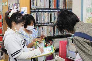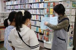 本などの種類や配置、探し方などについて、ラベルやパソコンを使って検索する方法を