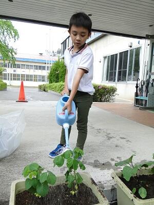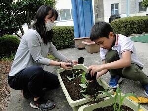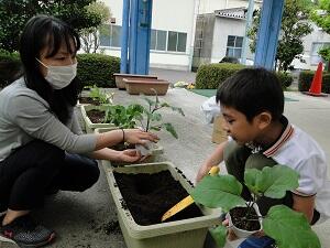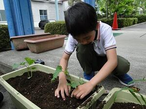 2年生の生活科では、植物を育てる学習をします。そこで、今回は野菜の苗を植えました。