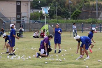 教職員も加わって、王様ドッヂビーをしている様子です。
