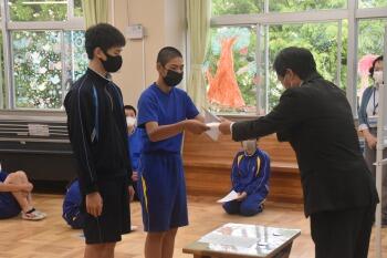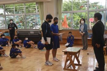 小中それぞれの代表が、校長先生から登録証を受け取り、誓いの言葉を発表しました。全校生も、代表2人の言葉に続けて一緒に唱えました。今回の誓いの言葉を胸に、日々の生活を送ってほしいと思います。