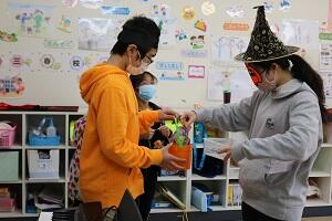 簡単なジャック・オー・ランタンやお化けの仮装をみんなで作っているところです。