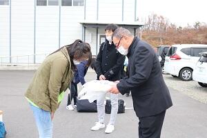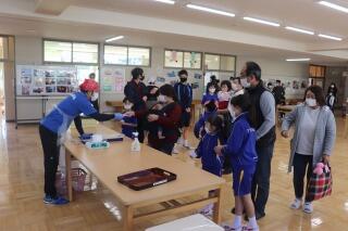 お店の方にゆでていただいた麺に、教員もお手伝いをさせていただいてトッピングしました。家族ごとに食べていただくため、事前に配付した食券をもとにラーメンを配付。皆様のご協力のおかげで、スムーズに配付できました。