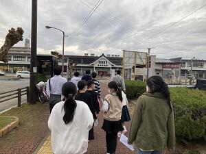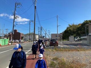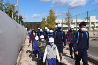 地震後の津波が来るという想定で、学校から富岡総合福祉センターへ避難を開始しました。本来なら走って避難しますが、今回は昨年と避難経路が変わったので、安全に道を確認しながら歩きました。