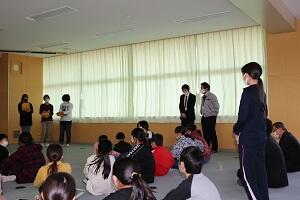 全体会では、教頭からの話と、町役場防災担当の佐々木様のお話を聞きました。佐々木様からは、最短距離で避難した浪江町の小学校の実際の話を聞き、避難の大切さを再確認できたと思います。振り返りでは、代表児童が「今日で避難経路が分かったから、もしもの時にはきちんと避難したい」といったことを立派に発表できました。