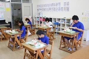 1学期同様、全員同じ方向を向いて間隔を空けて座り、黙って食事をする黙食を継続しています。