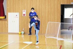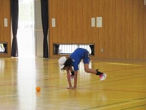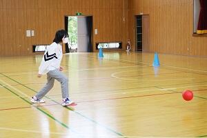 ティーボールの学習をするので、運動身体づくりプログラムの中にもボールを取り入れました。
