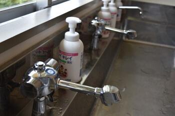 多目的ホールの水道は、触らなくても水が出るような蛇口を付けていただきました。これは上の部分だけの交換だったため短時間でできたようです。コロナ対策として、しっかり手を洗った後はどこも触らずに水で流すことができるようになりました。(水汲み等ができるようにはしの水道はそのままになっています。)