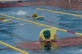 手前でビート板を持っているのは5・6年生です。スタートから13m(ちょうどプールの中央付近)に立ち、ここにタッチしたらゴールという目印になってくれました。