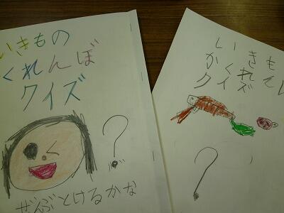 1年生は、国語の時間に「うみのかくれんぼ」という説明文の学習をしました。この学習では、いろいろないきものが、どこに、どのようにかくれているのかを読み取って確かめる活動をしました。少し長い文章もしっかり読み取れるようになってきた1年生は、「そうだ!わたしたちもクイズをつくってみよう!」と自分たちで調べて、教科書の文を参考にクイズを作ることができました。